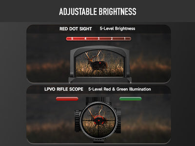 Whether you're shooting in bright daylight or in low-light conditions, the 5 Red & Green brightness levels on both the scope and red dot sight provide clear, bright visuals to keep you on target