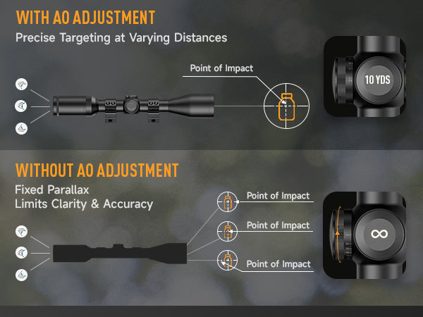 The parallax adjustment on this airsoft gun scope with R-02 Crosshair Reticle, from 10 yards to infinity, ensures a clear focus at varying distances, eliminating parallax error for improved precision with every shot