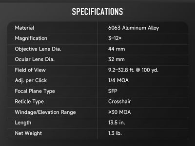 3-12x44 Rifle SFP Optical Scope with R-02 Crosshair Reticle