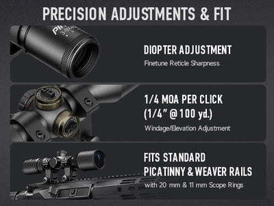 The Pinty 3-9x40 rifle scope gives you pinpoint accuracy for any shot. With adjustable 3x to 9x magnification, you can easily switch between close-range and long-distance targets. The precision mil-dot reticle and 1/4 MOA per-click windage and elevation adjustments ensure every shot is dead-on. The 40 mm multicoated lens offers bright, clear views with less glare, even in low light. Plus, the diopter adjustment lets you customize focus for your eyes. Easy mounting with the included 20 mm and 11 mm scope rings fits any standard Picatinny or Weaver rail. Built tough with an aircraft-grade aluminum body and nitrogen purging, this tactical rifle scope is waterproof, fogproof, and shockproof, ready for any weather or rough conditions. Whether you're hunting, target shooting, or competing, the Pinty 3-9x40 compact riflescope is your go-to for reliability and precision.