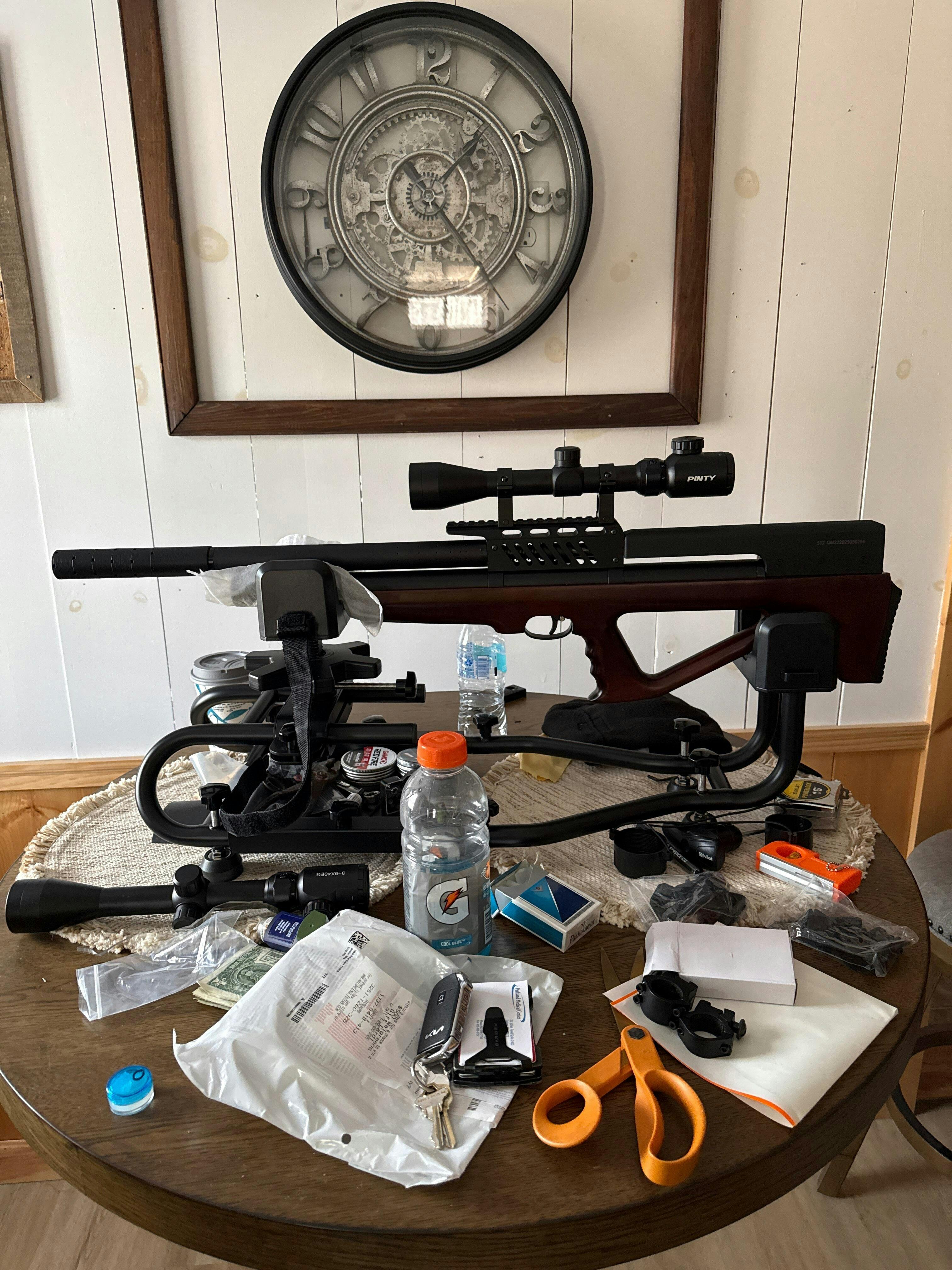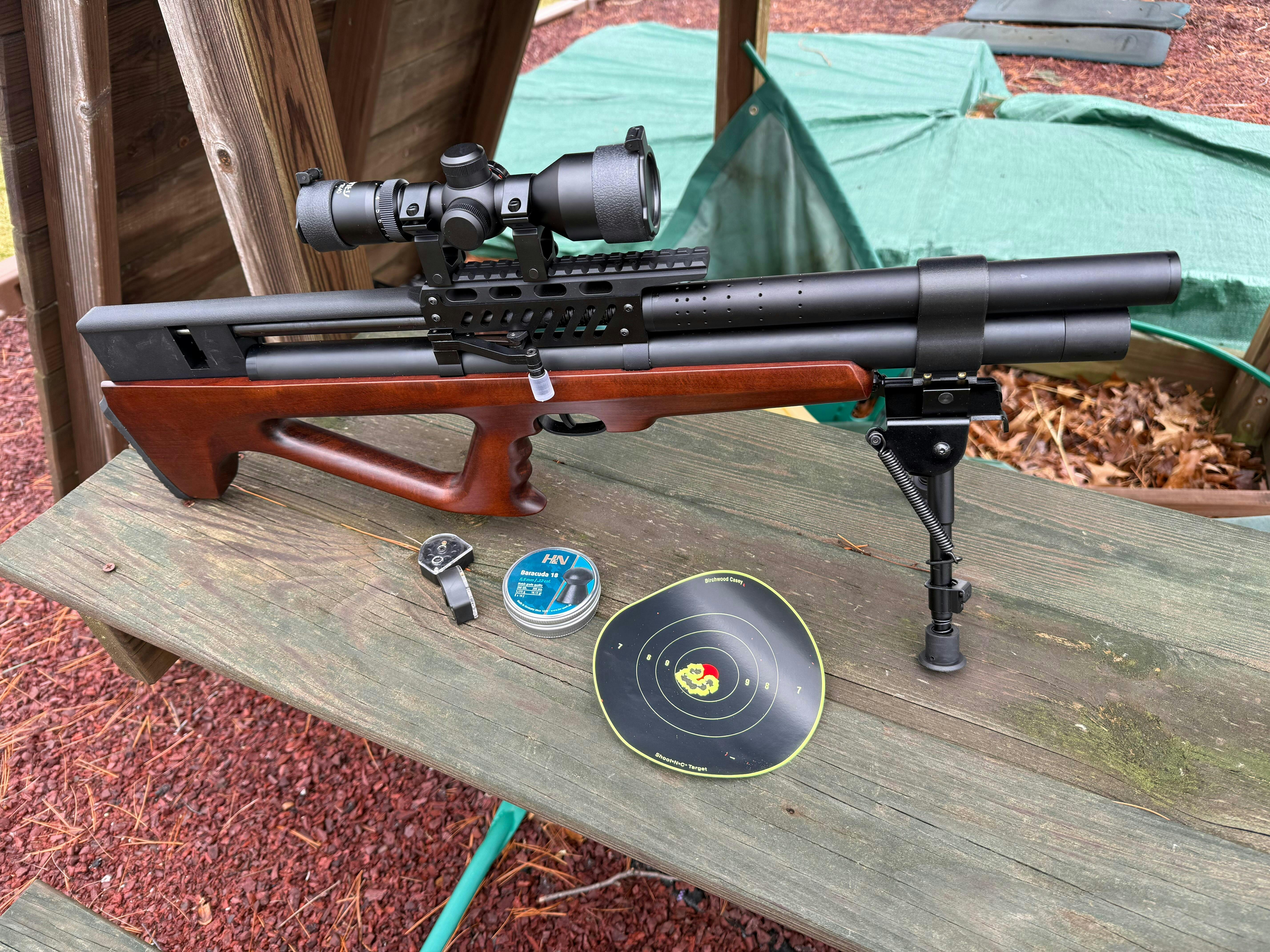 A .22 caliber bullpup PCP air gun with a wooden stock and Picatinny rail, designed for small game hunting and shooting.
