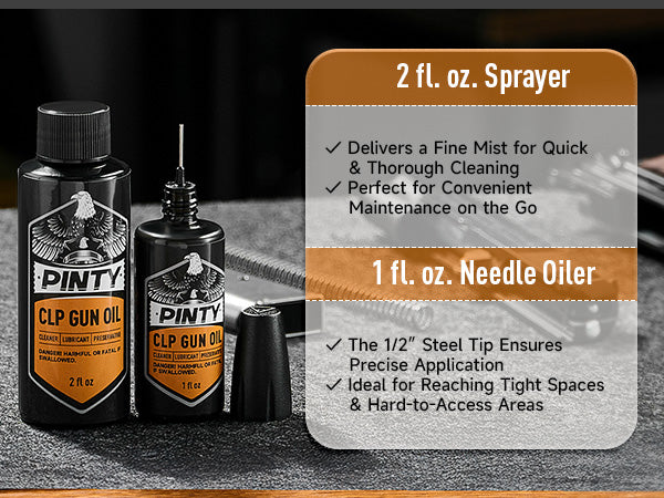 Pinty's gun oil kit includes a 2 fl. oz. fine mist sprayer and a 1 fl. oz. needle oiler for effortless cleaning, lubrication, and protection, ensuring your firearms stay in peak performance even during intense use