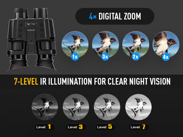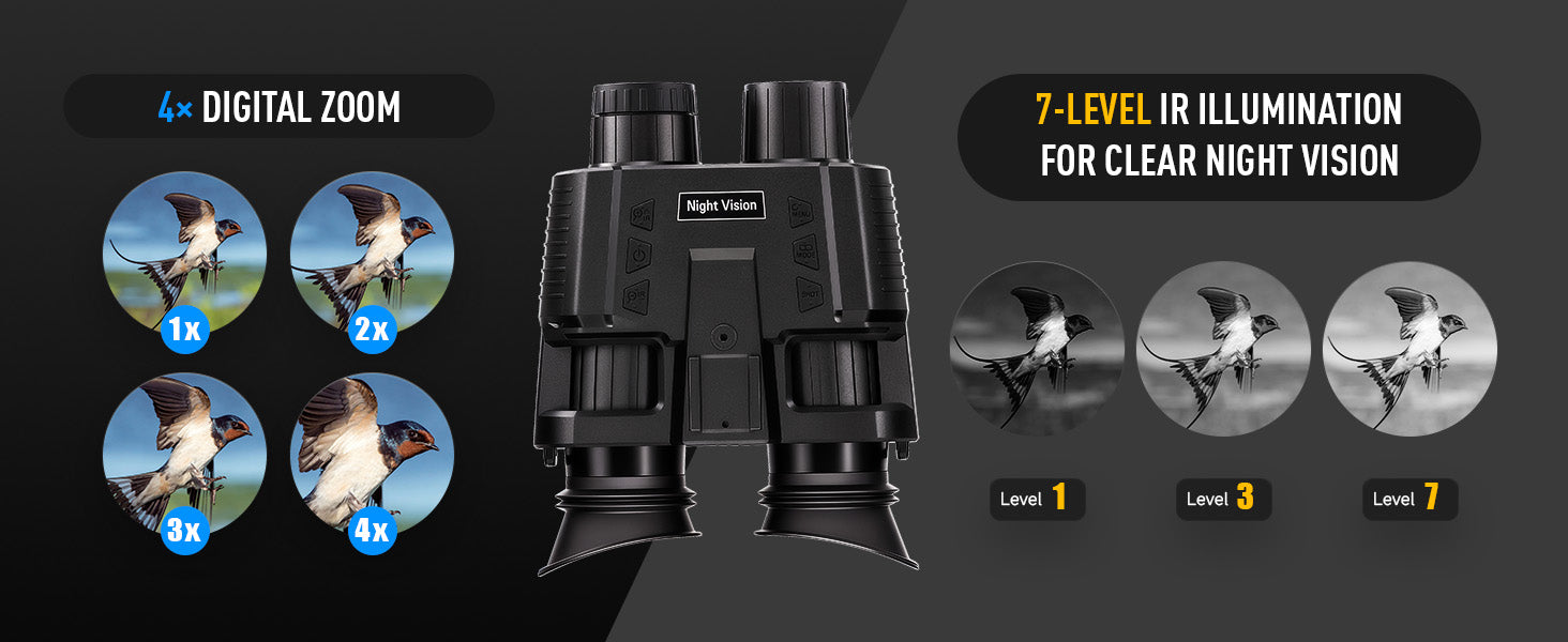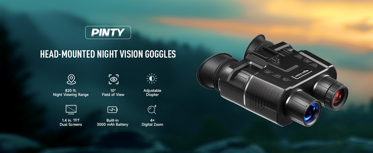 Elevate your nighttime adventures with Pinty's Tactical head-mounted binoculars, designed for durability with IP54 waterproofing and built to perform in any weather. Whether you're scanning distant landscapes with 7x magnification and dual 1.4 inch TFT screens or capturing the moment in crisp 1080P video and 3MP photo, every detail comes to life—even in the dark, thanks to this night vision goggles' 7-level infrared illumination. Adaptable to any situation, these night vision binoculars can be worn on your head, mounted on a helmet, or used handheld. Plus, with a long-lasting 3.7V 3000 mAh rechargeable battery and convenient Type-C charging, you're always ready for extended outdoor use.