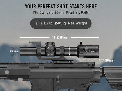 With 1-6x magnification and a throw lever, Pinty's FFP rifle scope transitions smoothly from close-range to mid-distance targets. Its fully multi-coated 24 mm green lenses deliver high-contrast views at any zoom level