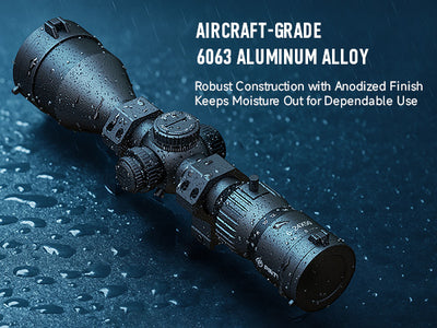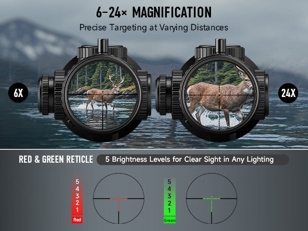 Pinty's 6-24x FFP rifle scope delivers the accuracy needed for long-range shooting. Our smooth magnification lever allows quick zoom adjustments, while the 50 mm fully multi-coated green lenses enhance brightness and contrast for a sharp view. Elevation settings can be adjusted with precision and instantly reset to zero for rapid target engagement, with windage and diopter controls fine-tuning every shot. Built to perform in any environment, the nitrogen-purged design prevents fogging, and the illuminated red & green reticle adapts to various lighting conditions. Constructed from lightweight aircraft-grade aluminum alloy, this shockproof riflescope is coated with a tough anodized finish to resist wear. Complete with two sets of ring mounts (11 mm & 20 mm) for Picatinny and dovetail rails, this hunting scope kit also includes glare-reducing flip-up lens covers and a bubble level to ensure perfect alignment.