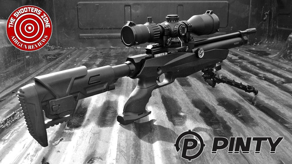 Black rifle scope with Pinty logo on a white background